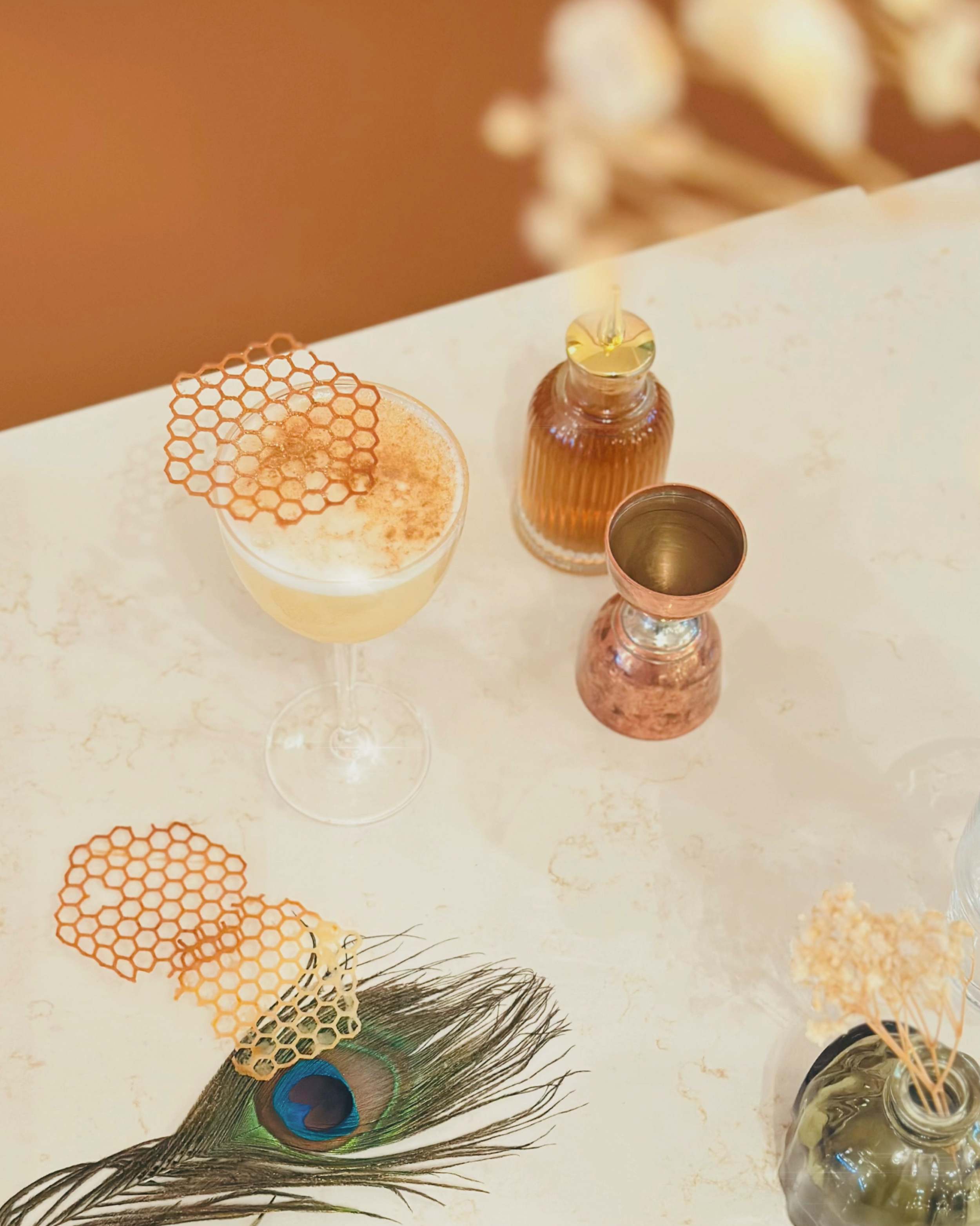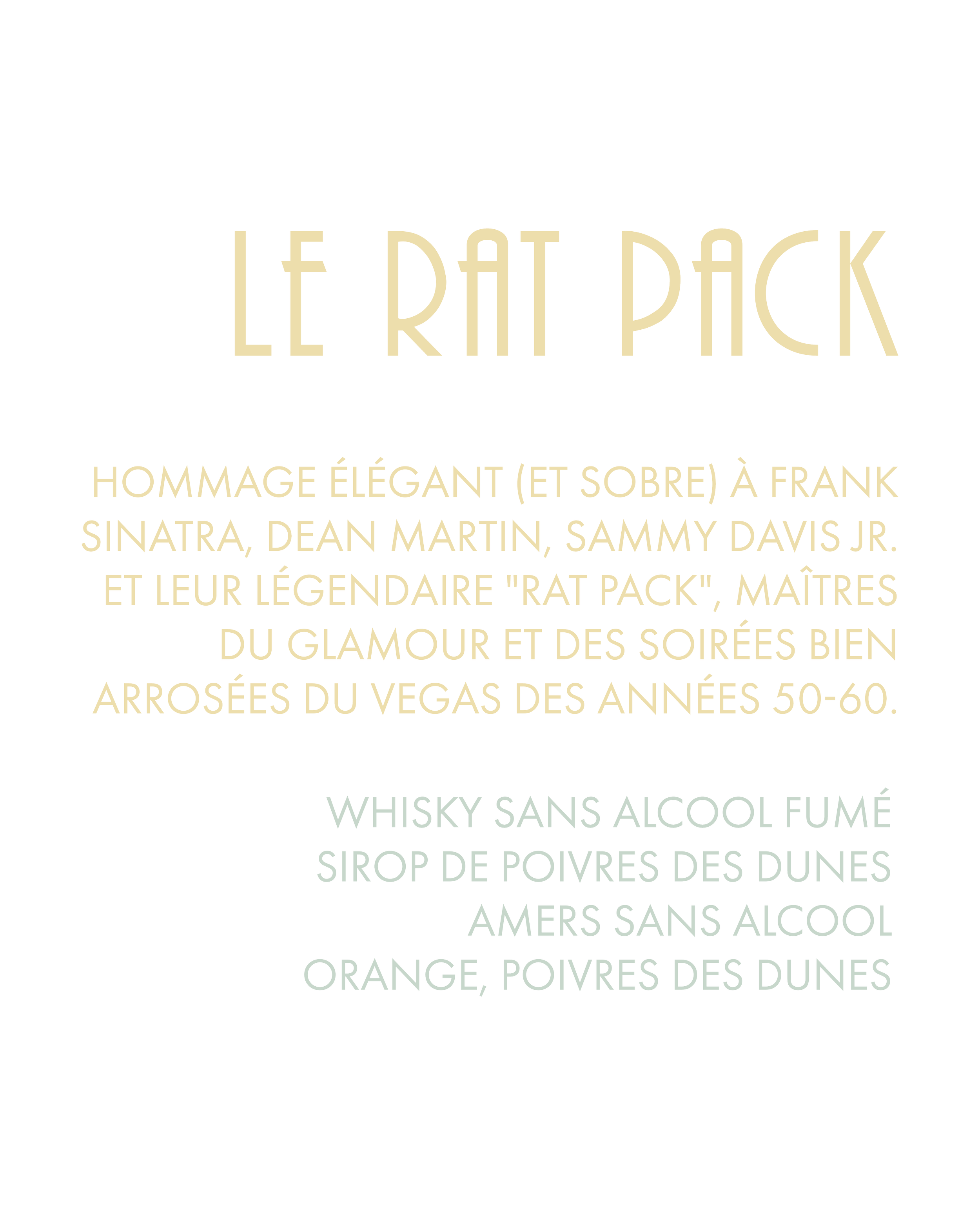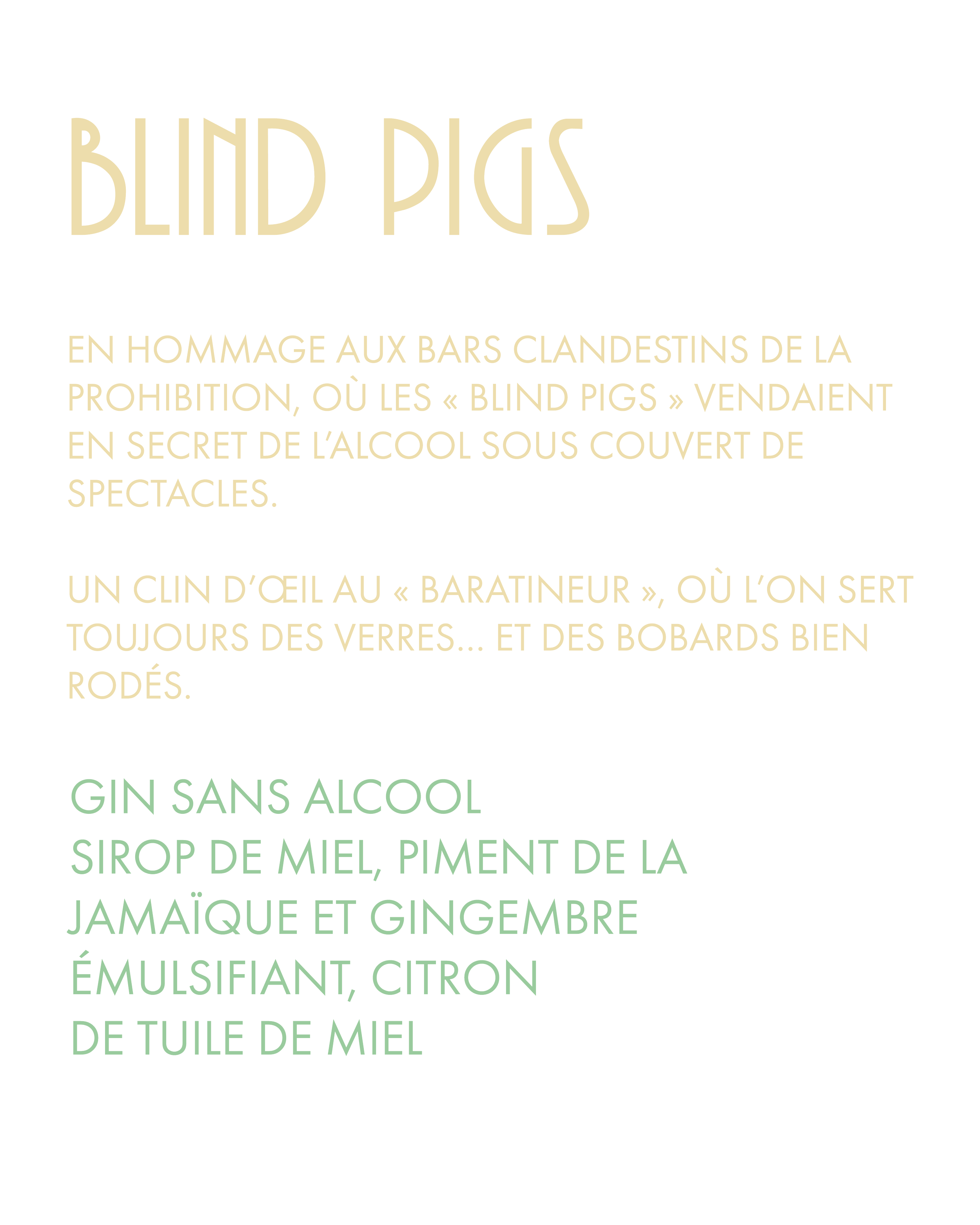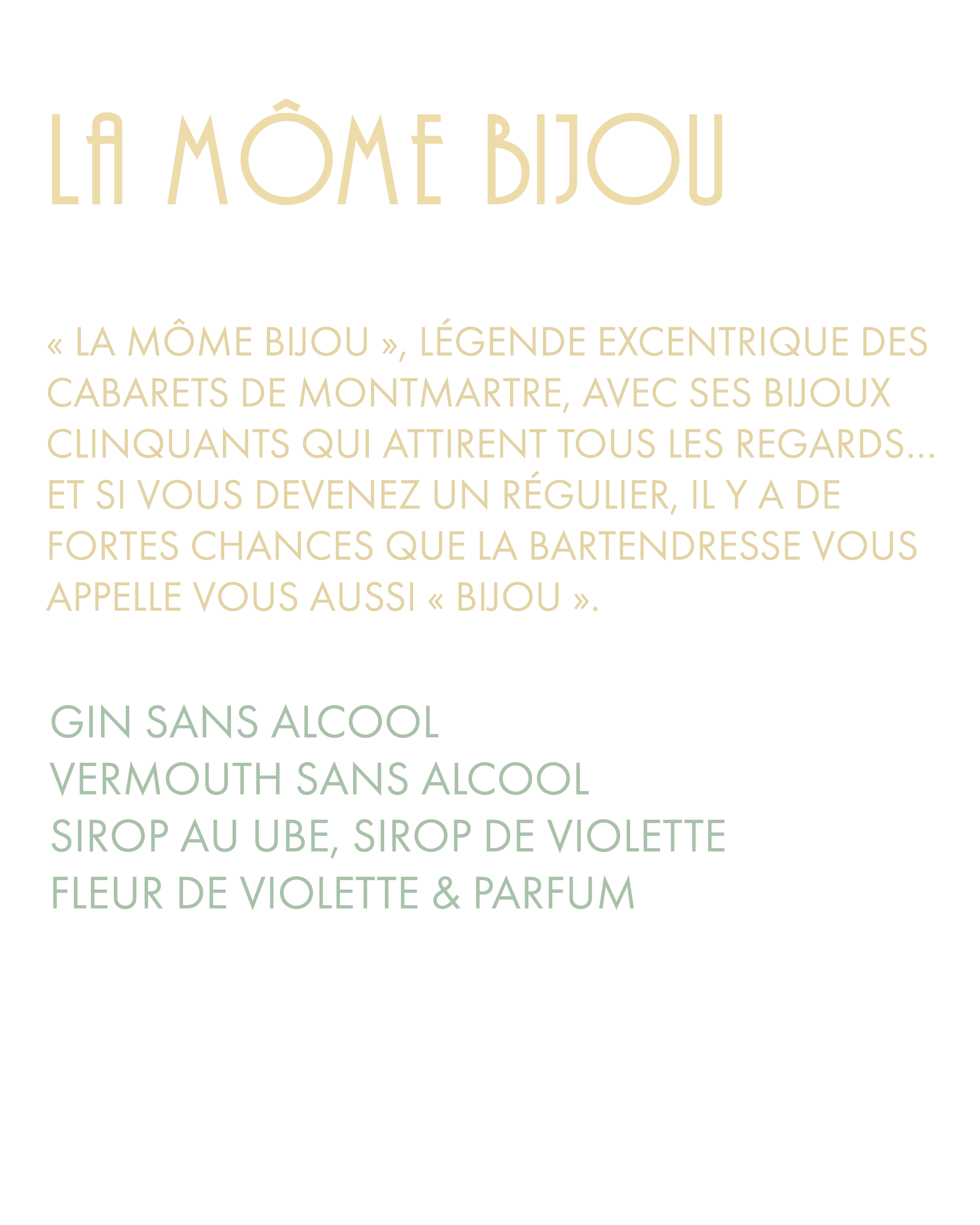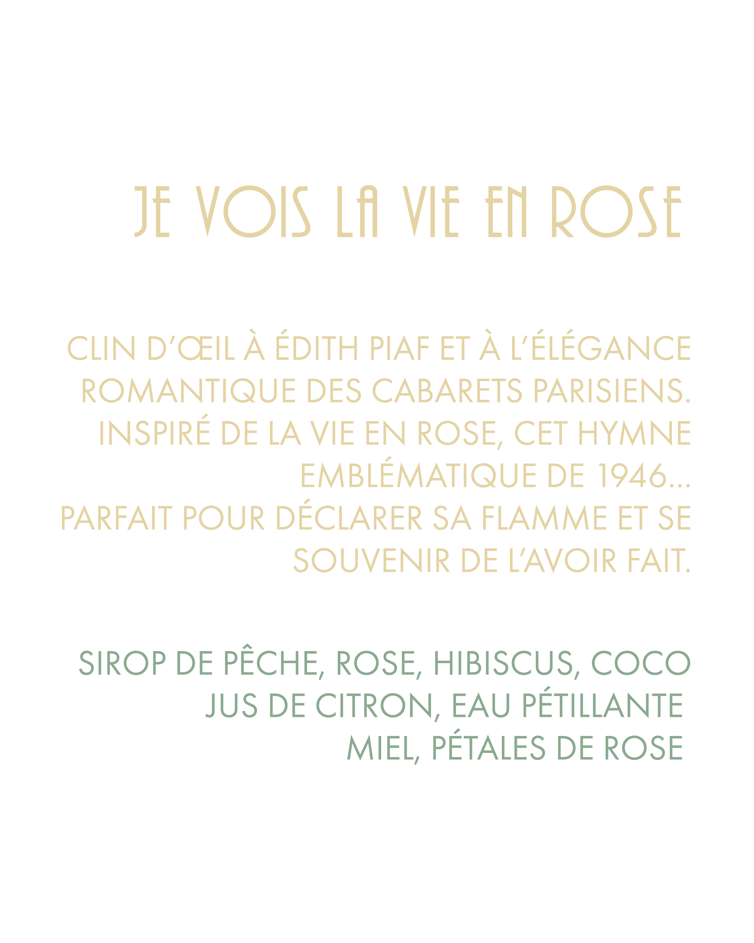 Je me suis naturellement inspirée de la culture française, tout en restant fidèle à mes inspirations et intérêts. J’ai souhaité mélanger à cette carte une touche à la fois musicale, humoristique et historique, tout en mettant en valeur des ingrédients locaux soigneusement sélectionnés, des spiritueux sans alcool de grande qualité et des sirops maison. Le tout a été pensé en étroite harmonie avec le travail des chefs en cuisine, afin de créer un véritable dialogue entre les cocktails et leurs créations culinaires.