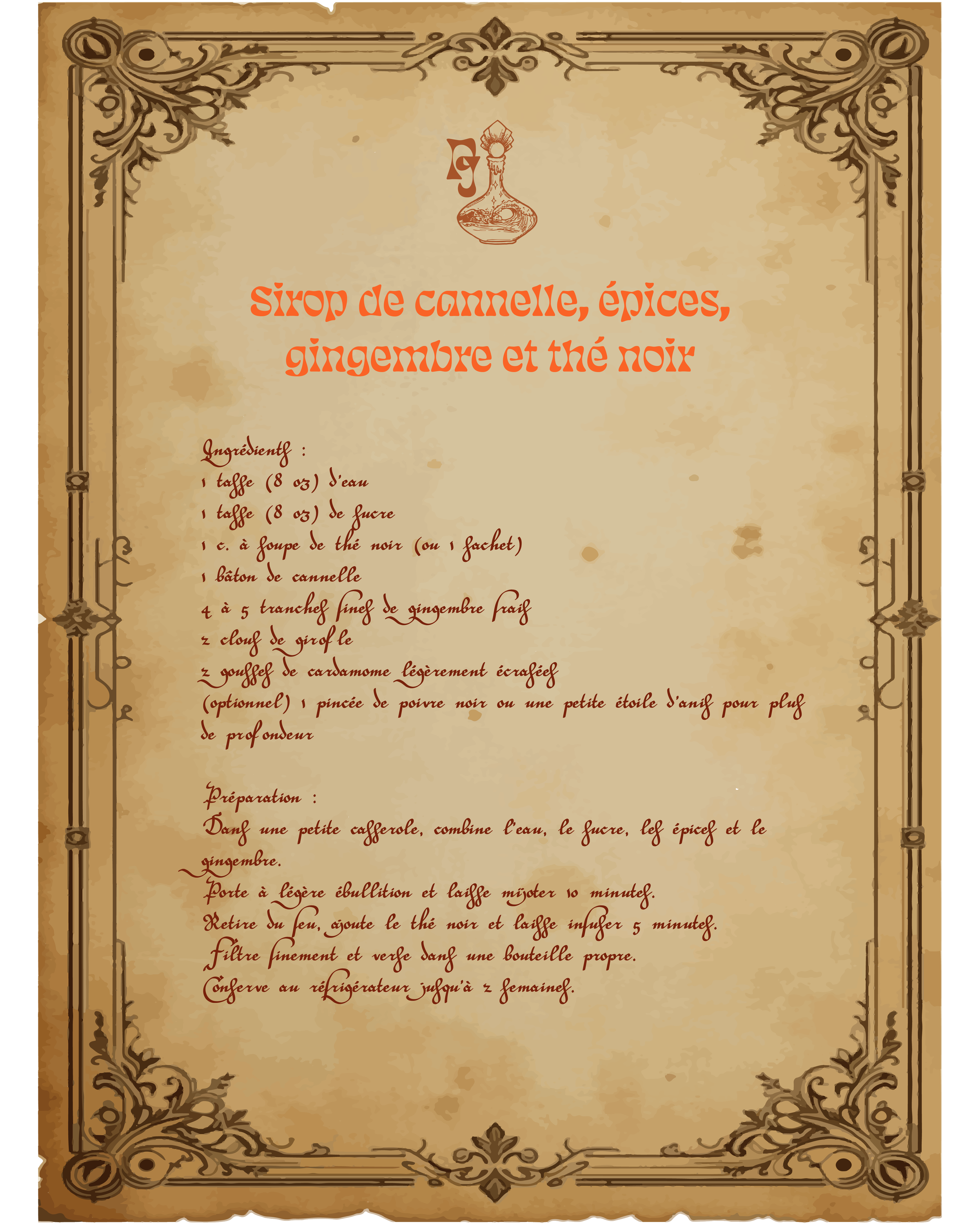 1 oz sirop cannelle, thé noir, camomille & gingembre
