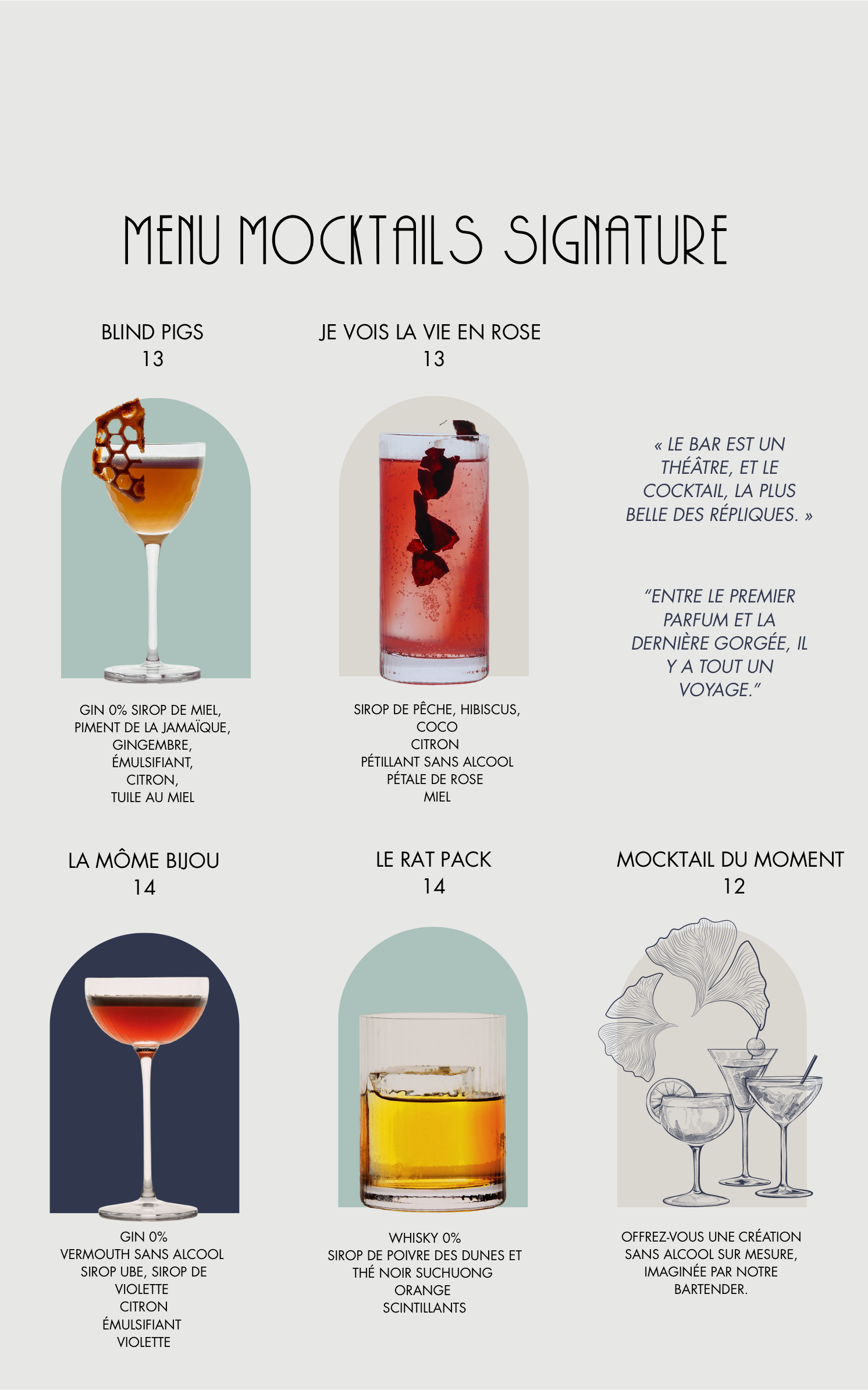 J’ai souhaité mélanger à cette carte une touche à la fois musicale, humoristique et historique, tout en mettant en valeur des ingrédients locaux soigneusement sélectionnés, des spiritueux sans alcool de grande qualité et des sirops maison.