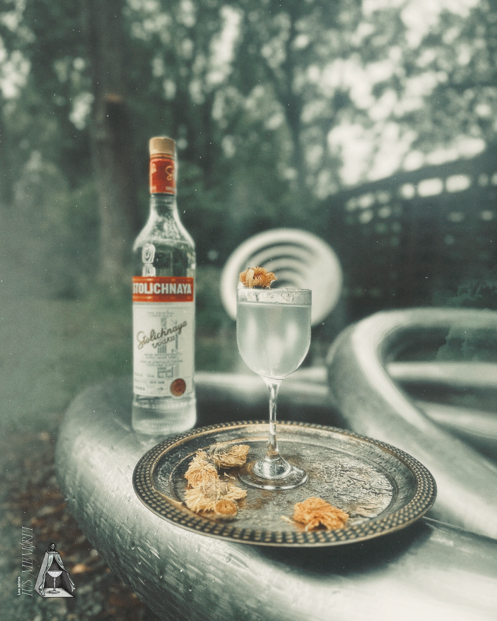 Dans cette création on y retrouve de la vodka Stolichnaya, un sirop maison de fleurs calendula, de la crème de violette, un peu de lime et du vermouth blanc Dolin.