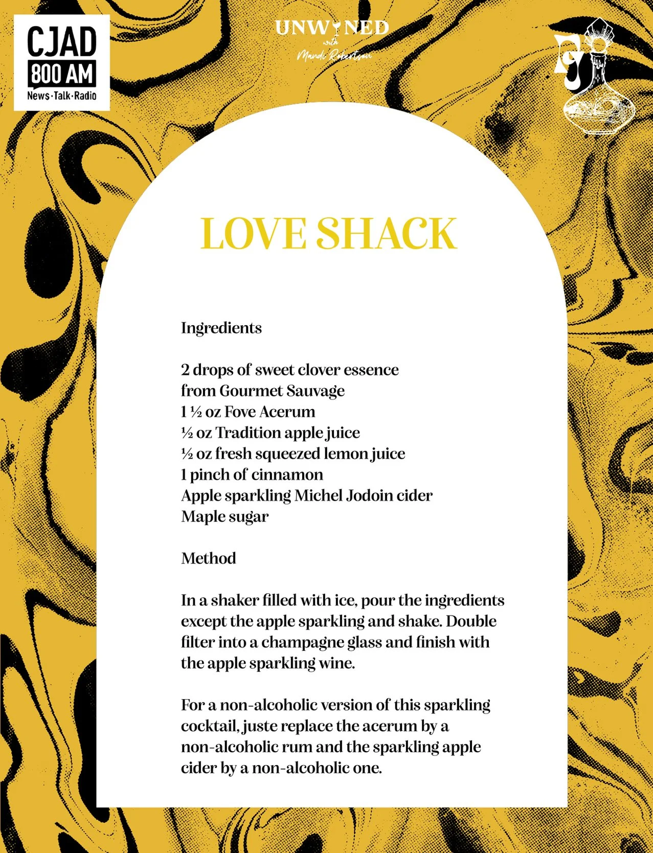 It’s maple shack season and we celebrate our local products! Especially our spirit, the wonderful Acerum with a special cocktail with Patricia & Mandi on Unwined, CJAD 800 Montreal.Cheers! Listen the full episode of Unwined To discover more about the wonders of our local spirit, Acerum, and its production process, follow @semainedelacerum on instagram and www.acerum.ca. Discover the sweet clover extract from Gourmet Sauvage and where to find it, one of my favorite magic ingredient in my cocktail creations and Michel Jodoin sparkling ciders.