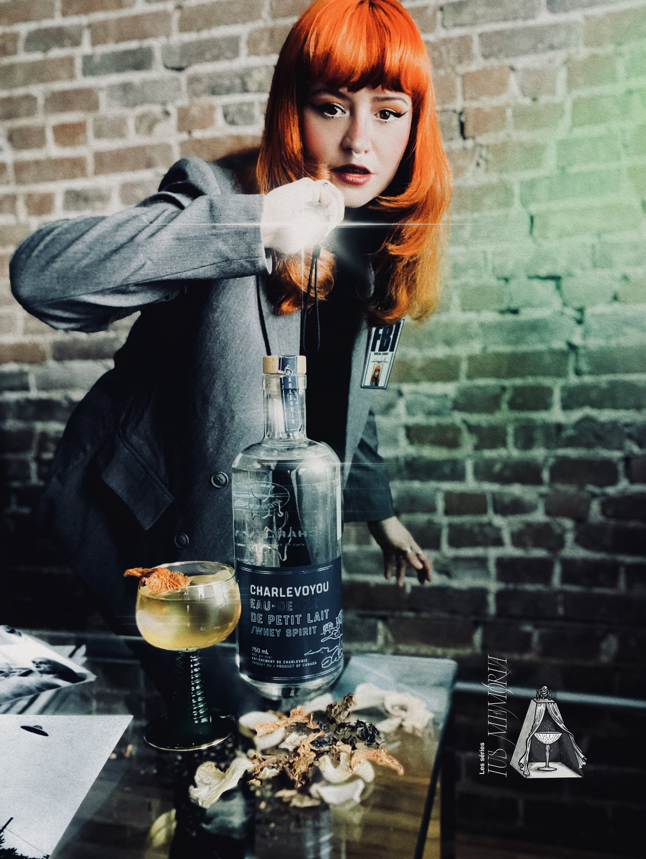 On y retrouve un sirop de champignon chanterelle, cepe et orange sanguine, l'Eau-de-vie de lactose Charlevoyou de la Famille Migneron, des chanterelles déshydratées en décoration, des amers forestiers et du citron.